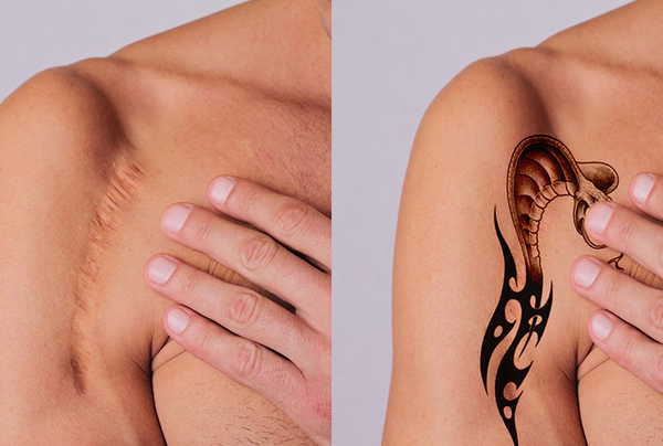 Послеоперационные шрамы требуют от мастера пространственного мышления. Объемные и неровные линии нужно вписать в красивую композицию. Для этих целей выбираются мотивы, которые своими силуэтами возместят нанесенный эстетике ущерб.